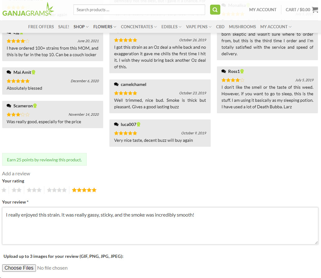 Visit Ganjagrams and leave a review on the products you ordered. You’ll earn 100 loyalty points for every review!