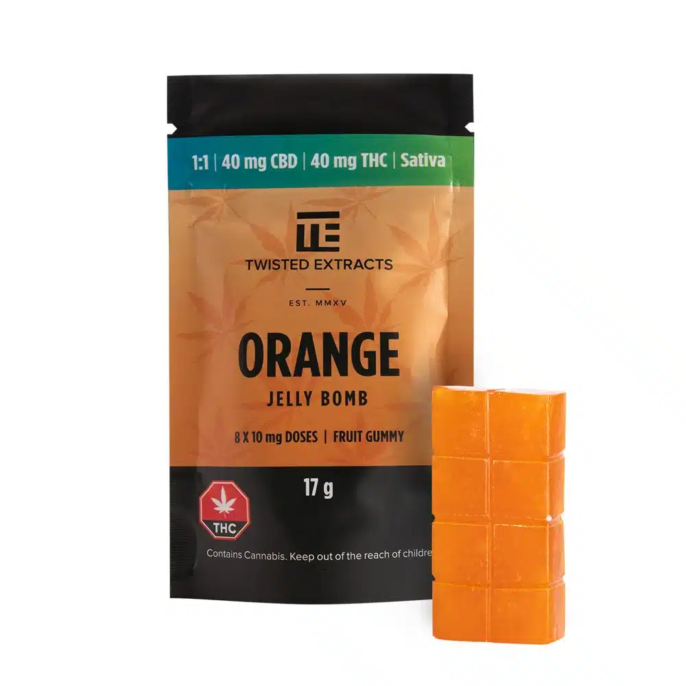 Citrusy and well-balanced. Each Orange 1:1 Jelly Bomb is a fully-infused Cannabis gummy containing 40 mg of CBD and 40 mg of THC extracted from a Sativa dominant Cannabis extract. It can be easily divided into 8 pieces so you can choose your ideal dose. Edibles are a great way to consume Cannabis in convenient, consistent and discrete way.