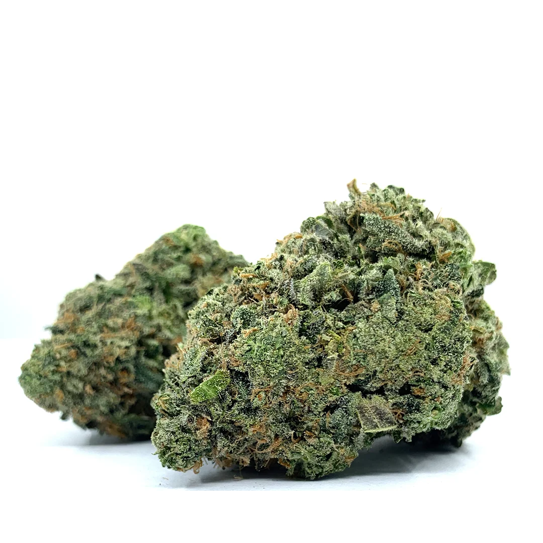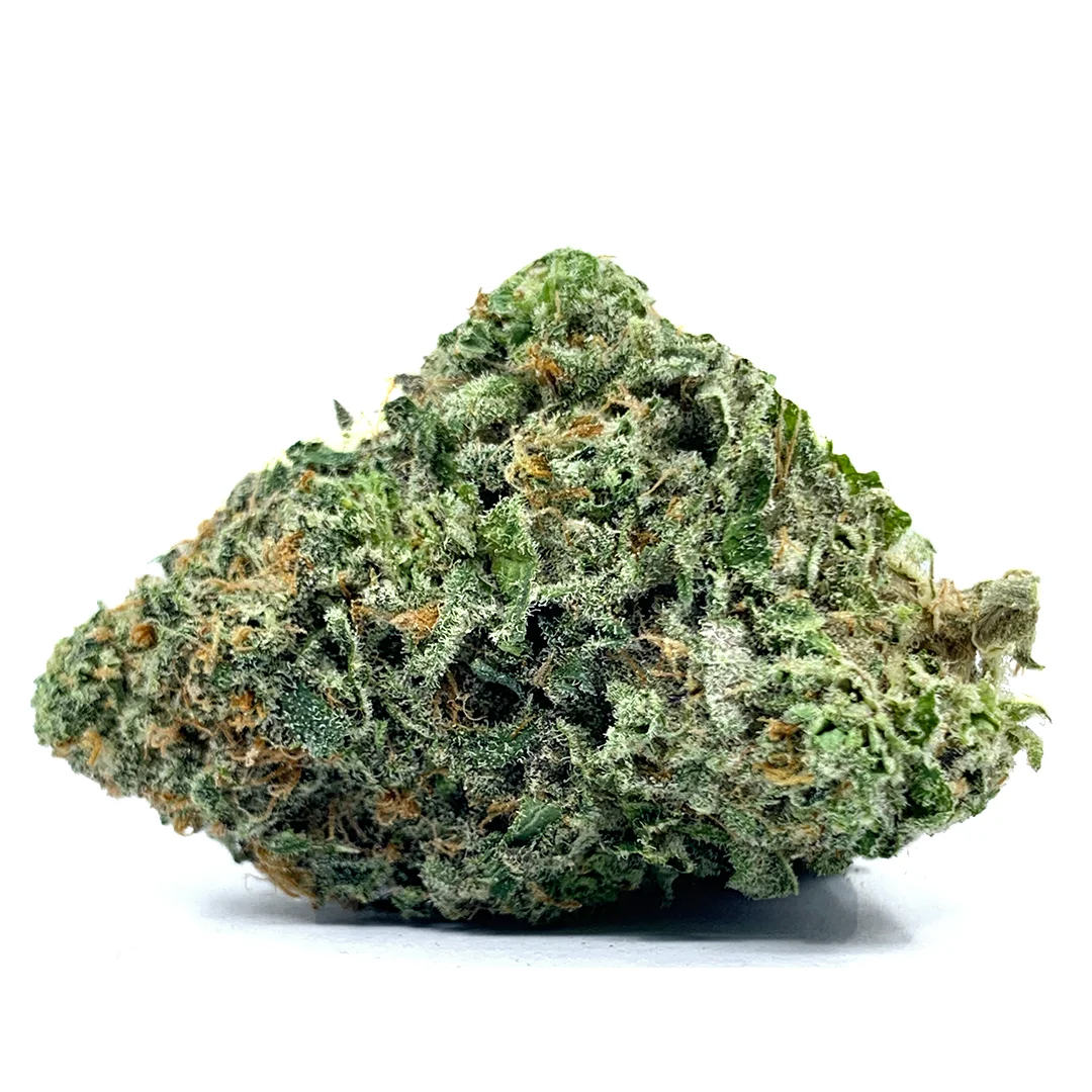 Dense, frosted buds with hints of purple and bright orange pistils, shimmering under a coat of trichomes. Its creamy scent lingers even before the first grind, promising a rich session ahead.