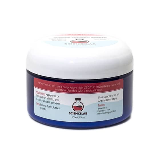 This is a high CBD, high THC topical lotion for patients to apply onto their skin. This product uses proprietary strain which is then turned into CO2 extracted oil which is then blended into our lotions. One jar contains a total of 290mg of cannabinoids. Made by Science Labs, a reputable Canadian company known for creating cannabis infused products.